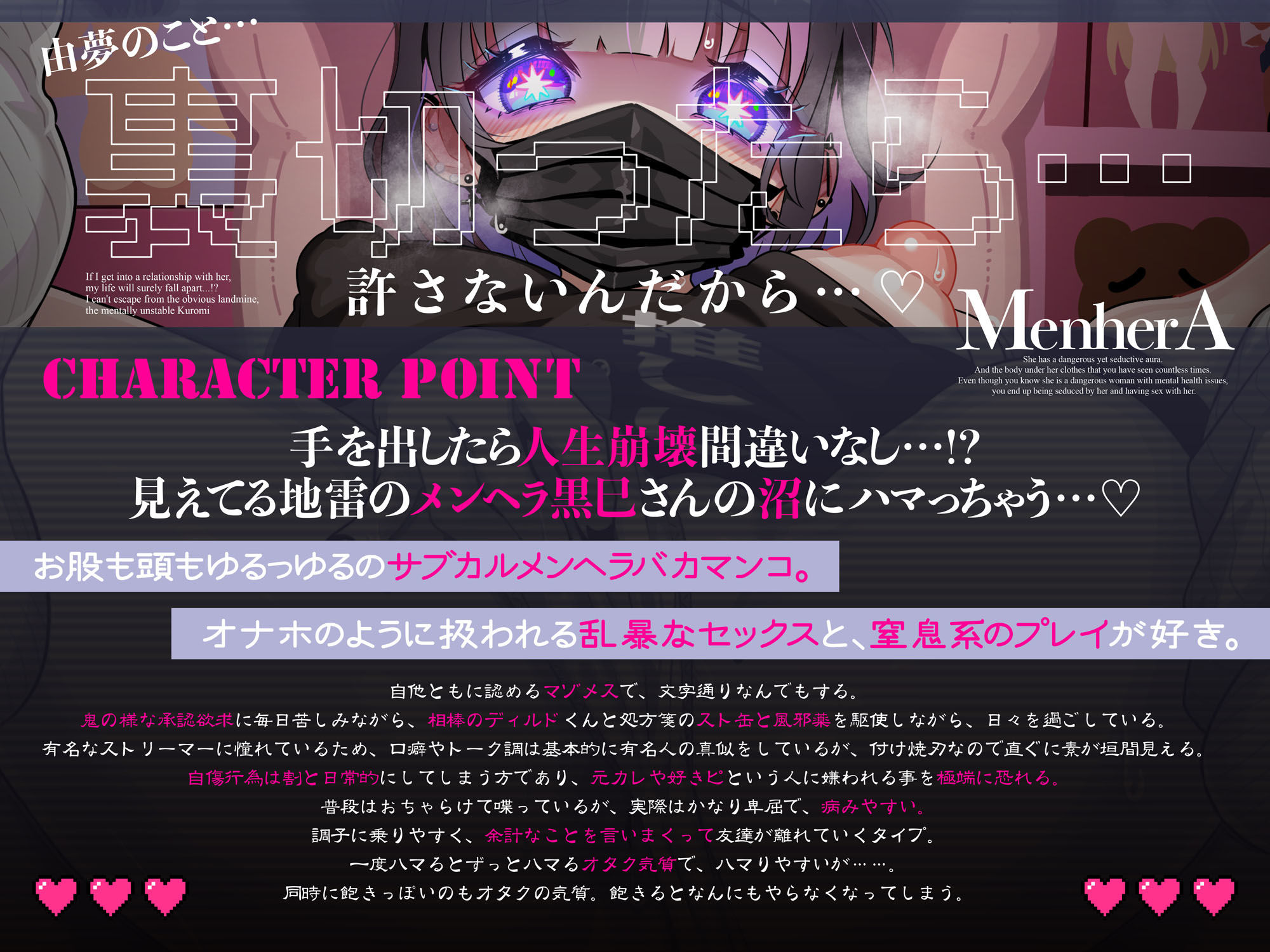【ODし過ぎてガンギマリおほ声でパキッちゃう系】承認欲求高めメンタルクソ雑魚 見えてる地雷のメンヘラ黒巳さんをただ幸せにするお話ASMR【KU100】 あらすじ