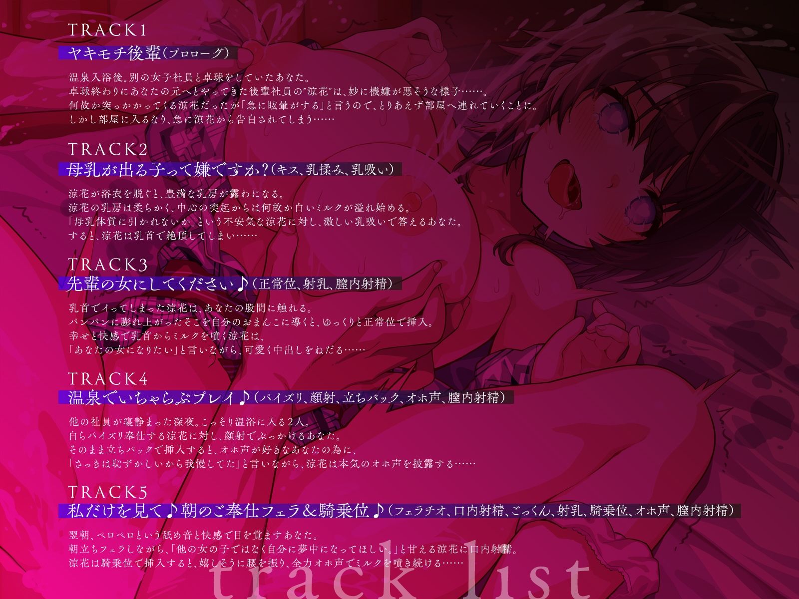 温泉社員旅行。嫉妬した後輩女子による全力告白、全力オホ声、全力噴乳♪(KU100マイク収録作品) あらすじ