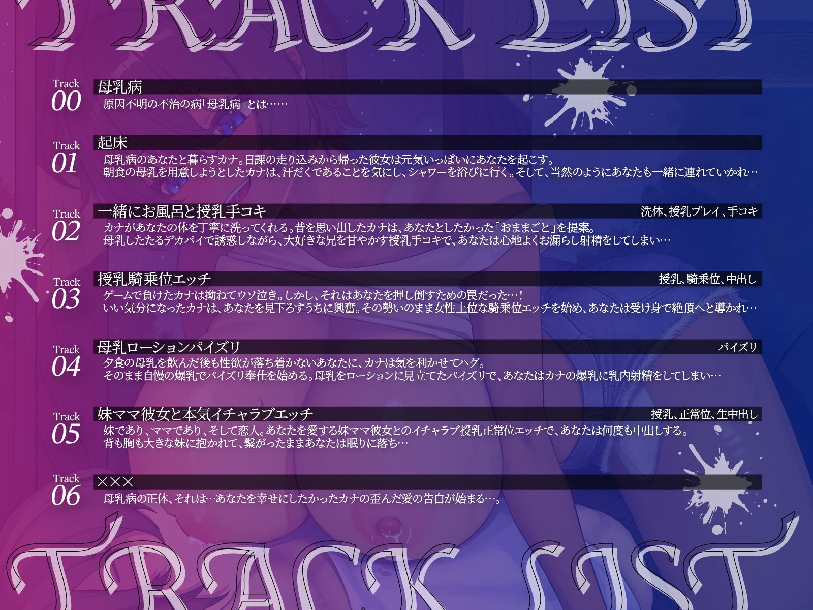 ジャンル: 巨乳、中出し、母乳、ラブラブ・あまあま、実妹、シリーズもの、男性向け、成人向け、バイノーラル、オホ声、KU100、授乳